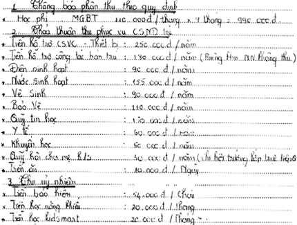 Chị Hoa dẫn chứng, ngoài tiền điện 70.000 đồng một học sinh mỗi năm, các em còn phải đóng tiền nâng cấp dây điện 40.000 đồng. Mỗi lớp 50 học sinh thì tổng số tiền 2 triệu đồng đủ để thay cả hệ thống điện của phòng học chứ không chỉ nâng cấp. Ngoài ra, bên cạnh tiền vệ sinh, mỗi em còn phải đóng thêm khoản xanh - sạch - đẹp 120.000 đồng, tiền lao động 250.000 đồng.