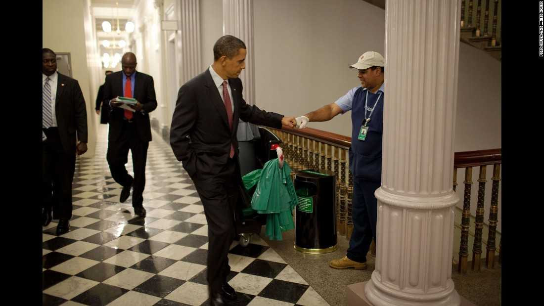 Tổng thống Obama cụng tay với một nhân viên bảo hành, sữa chữa của Nhà Trắng