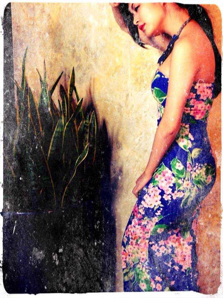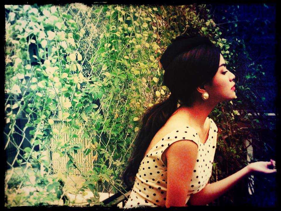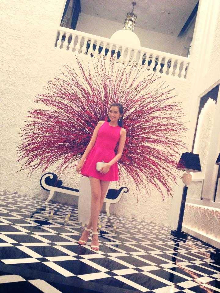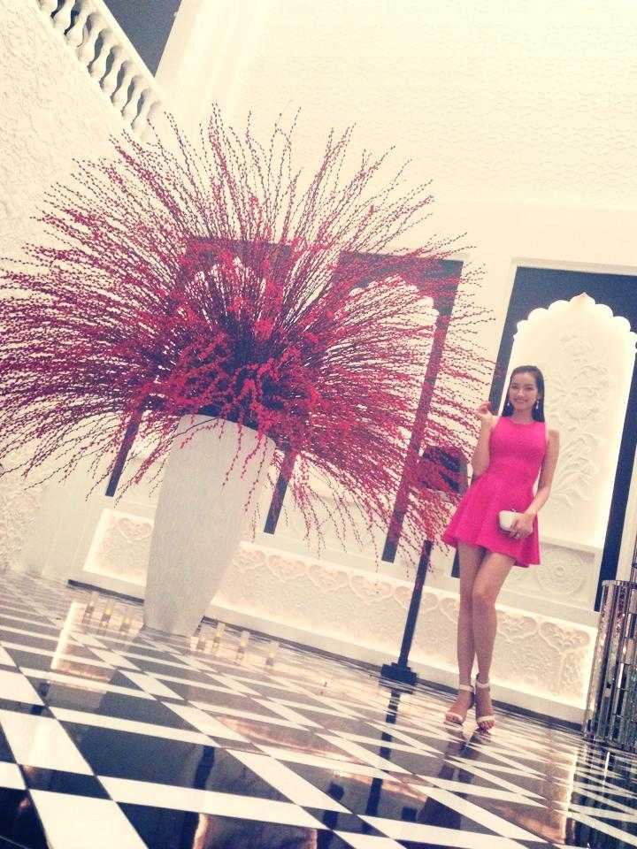 Trúc Diễm tạo dáng bên bình hoa khổng lồ.