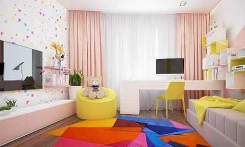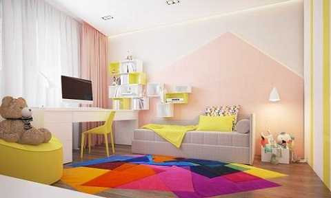Trong phòng dành cho trẻ, màu sắc được sử dụng đa dạng hơn. Những tấm thảm cùng họa tiết hình học nghệ thuật trên tường giúp tăng sự sáng tạo cho trẻ nhỏ.