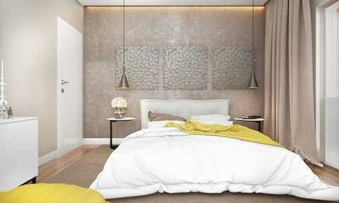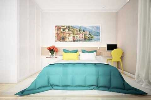 Phòng ngủ có gam màu sáng hơn, một chiếc chăn lông vịt tuyệt đẹp, đầu giường được trang trí bằng những bức tranh nghệ thuật.
