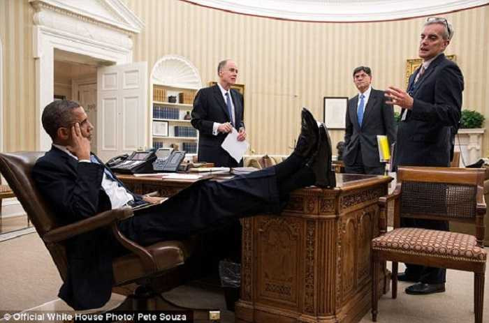 Tổng thống Obama vô tư gác chân lên bàn khi thảo luận các vấn đề của nhà nước với các cố vấn Tom Donilon, Jack Lew, Denis McDonough tháng 11/2012
