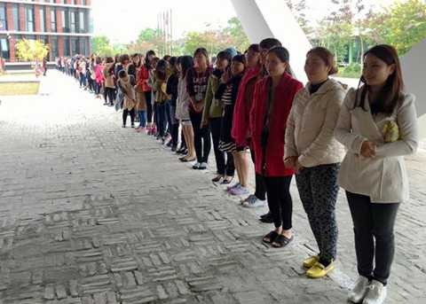 | Nhân viên nữ xếp hàng chờ nhận lì xì. Ảnh: HNT |