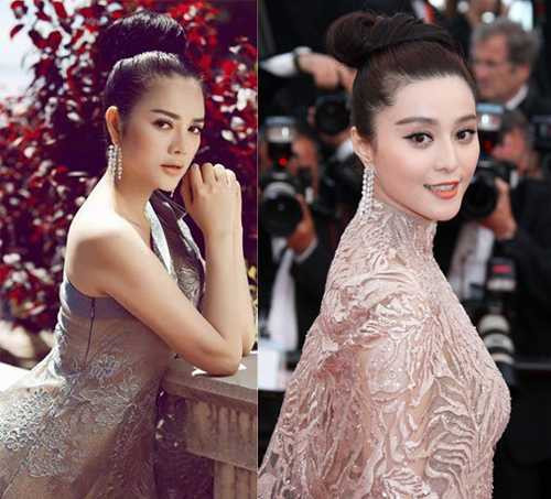| Lý Nhã Kỳ thường chọn nhiều kiểu tóc theo phong cách giống Phạm Băng Băng. Cách trang điểm, tạo độ thẳng cho lông mày hay kiểu tán mắt giữa hai người không khác nhau là bao. Với kiểu tóc rẽ ngôi giữa và thả tự nhiên này, hai người như chị em sinh đôi. Ngay cả đôi hoa tai dáng dài, gần chạm vai cũng giống nhau. |