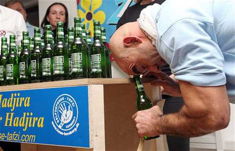 Chỉ trong một phút ông Ahmed Tafzi dùng đầu rất khỏe của mình để mở được hơn một chục nắp chai.
