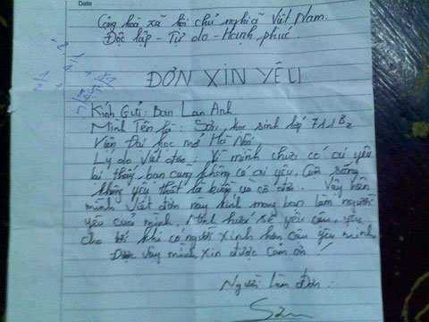 "Kính gửi bạn Lan Anh. Mình tên là Sơn, học sinh lớp 711B2. Viện Đại học Mở Hà Nội. Lý do viết đơn: Vì mình chưa có ai yêu, cuộc sống không yêu thật là buồn và cô đơn. Vậy nên mình viết đơn này kính mong bạn là người yêu của mình. Mình hứa sẽ yêu cậu, yêu cho tới khi có người xinh hơn cậu yêu mình. Được vậy thì mình xin được cảm ơn!"