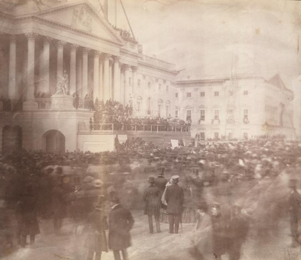 Đám đông tập trung theo dõi lễ nhậm chức của Tổng thống Abraham Lincoln, được tổ chức vào một ngày mưa tại sân Điện Capitol vào năm 1865.