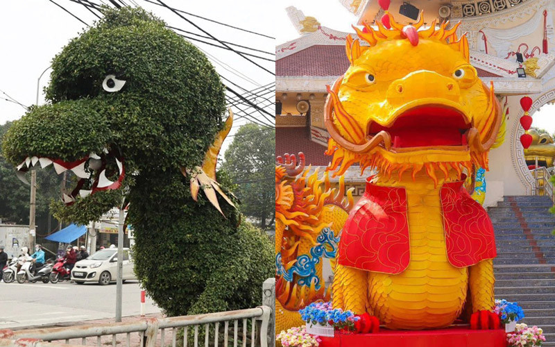 Cặp rồng bằng cây xanh tại cầu Kênh Bắc, thành phố Vinh, Nghệ An gây xôn xao dư luận nhiều ngày qua. Ngoài hình dáng được nhận xét là "giống lươn chứ không giống rồng", các bộ phận mắt, miệng được lắp bằng những tấm nhựa màu trắng còn tạo cho rồng vẻ "giận dỗi" khiến nhiều người phì cười. (Ảnh: Nghệ An 24h)