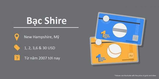 Bạc Shire: Đồng bạc Shire được làm từ một tượng bạc và vàng nhỏ, với kích cỡ bằng thẻ tín dụng. Đây là loại tiền địa phương của New Hampshire, nhưng người sáng tạo ra chúng khẳng định đã nhận được đơn đặt hàng từ khắp nơi trên thế giới.
