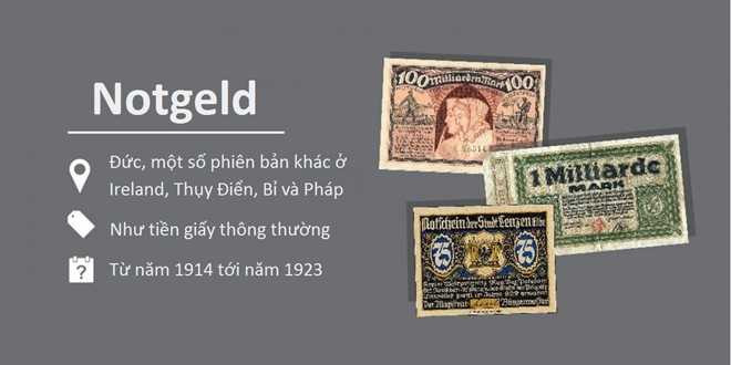Notgeld: Notegeld (nghĩa là "tiền khẩn cấp" trong tiếng Đức) được dùng trong giai đoạn đầu của Thế chiến II, khi không đủ kim loại để đúc tiền xu. Được sử dụng từ 1914 tới 1923, Notgeld đạt đỉnh cao vào giai đoạn 1922-1923. Lượng Notgeld được phát hành vào giai đoạn đó nhiều đến mức phải dùng cả lụa và bìa làm nguyên liệu.