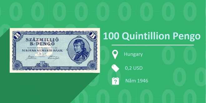 100 Quintillion Pengo: Sau Thế chiến II, cứ mỗi 15 tiếng giá cả ở Hungary lại tăng gần gấp đôi, khiến quốc gia này rơi vào tình trạng siêu lạm phát cao nhất trong lịch sử. 100 Quintillion Pengo là tờ tiền hợp pháp có mệnh giá lớn nhất, với giá trị khoảng 0,2 USD. Nguồn: Zing