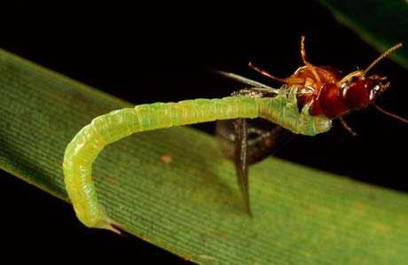 Các loài côn trùng dễ dàng bị lừa khi chính chúng lại tưởng các loài sâu bướm này là con mồi. Khi chúng tiến đến thì bất ngờ bị loài sâu này phản công. Chúng dùng đôi chân trước sắc nhọn mà chọc vào cơ thể con mồi. Sau đó chúng sẽ có một bữa ăn thịnh soạn và đầy đủ dinh dưỡng.