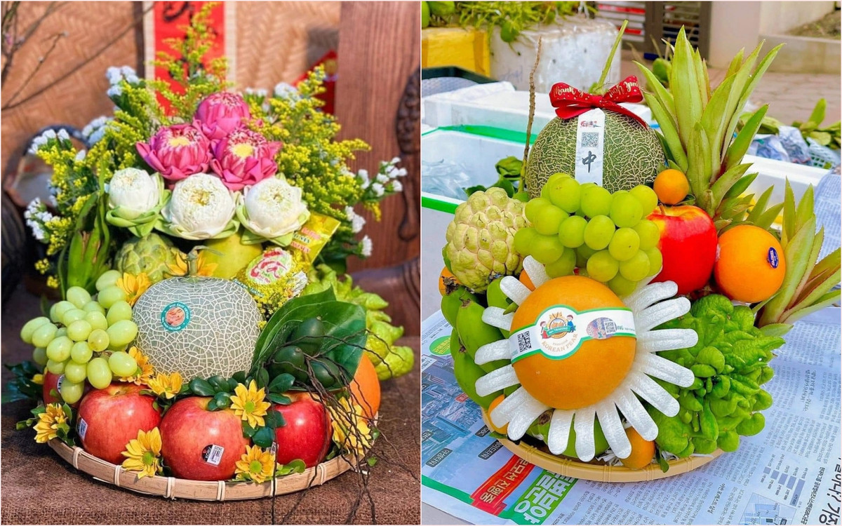 Đơn cử, một mâm gồm 1 trái lê, 2 trái thanh long ruột đỏ, 2 trái táo nhập khẩu, cau, trầu, 3 bông hoa sen quan âm và hoa cúc cắm điểm giá chỉ 300 nghìn đồng. Còn mâm lễ gồm 1 trái dưa hấu tỉa chữ nghệ thuật, 3 nải chuối xanh, 1 trái phật thủ, 7 trái cam, 3 trái táo, 1 chùm nho kết hợp với 5 bông hoa sen, hoa bưởi, hoa cúc hoặc lan... có giá gần 5 triệu đồng.