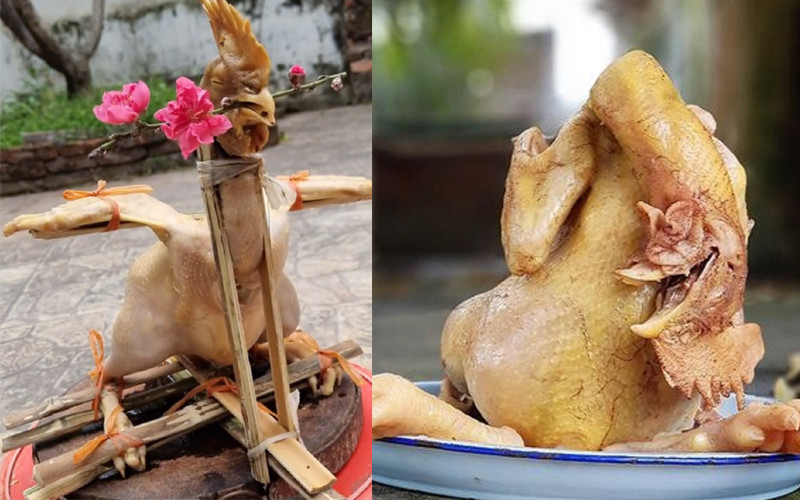 Luộc gà cánh tiên đã khó, tạo dáng gà bay càng khó hơn. Chủ nhân bức ảnh này đã nghĩ ra cách buộc gà bằng những thanh tre để giữ đúng dáng bay. (Ảnh: Tiktok/comanngontv02)