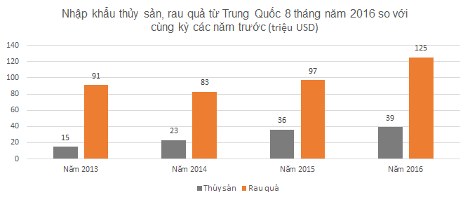 Tuy nhiên, ở chiều ngược lại, Việt Nam chi khá nhiều tiền cho việc nhập các mặt hàng này từ Trung Quốc. Cụ thể, 8 tháng đầu năm 2016, Việt Nam chi 39 triệu USD nhập thủy sản và 125 triệu USD nhập rau quả từ Trung Quốc, các con số này tăng mạnh so với cùng kỳ năm trước.