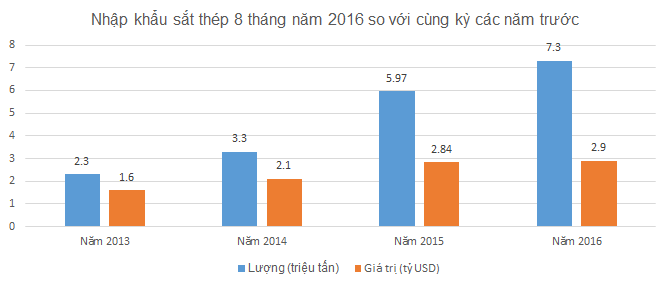 Theo số liệu Tổng cục Hải quan, 8 tháng đầu năm 2016, Việt Nam chi 2,9 tỷ USD nhập 7,3 triệu tấn sắt thép từ Trung Quốc, tăng mạnh cả về lượng và giá trị so với cùng kỳ năm ngoái.