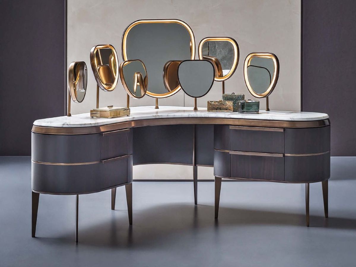 Chiếc bàn trang điểm sang trọng này sẽ cuốn hút bất kỳ người phụ nữ nào. Chiếc bàn có hình dáng uốn lượn nhẹ nhàng, bao quanh thân người khi bạn ngồi xuống. Ngăn lưu trữ được bố trí ở hai bên của bàn. Nhiều chiếc gương nhỏ với những hình dáng khác nhau đặt trên bề mặt cẩm thạch mang đến vẻ sang trọng và độc đáo.