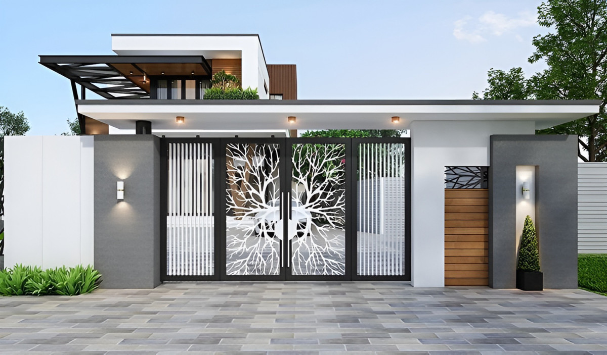Mẫu cổng nhà trên được thiết kế khá đơn giản, tối ưu mọi họa tiết trên bề mặt khung cũng như cánh cửa. Kết hợp hai màu sáng tối sẽ tôn lên được nét đẹp tổng thể của toàn bộ cổng nhà này.