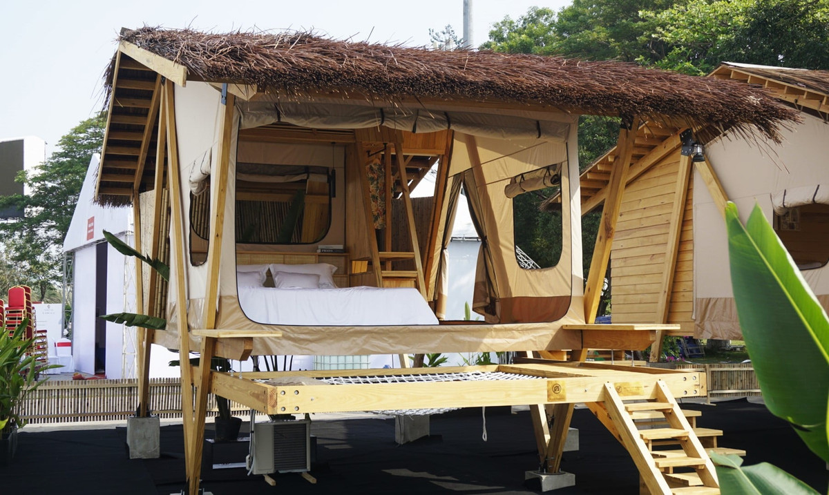 Nhà gỗ Bungalow tại hội chợ chủ yếu là bằng gỗ và các vật liệu tự nhiên khác như tre, nứa, cói... thân thiện với môi trường.