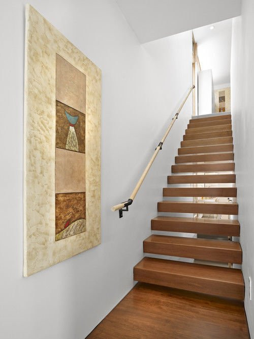 Thêm một mẫu cầu thang lơ lửng giữa nhà nữa. Ở đây, các bậc thang được gắn cố định vào tường giúp không gian nhà trở nên rộng rãi hơn đáng kể. Tuy nhiên, do mẫu cầu thang này không có tay vịn nên bạn cần cân nhắc nếu gia đình có trẻ nhỏ.