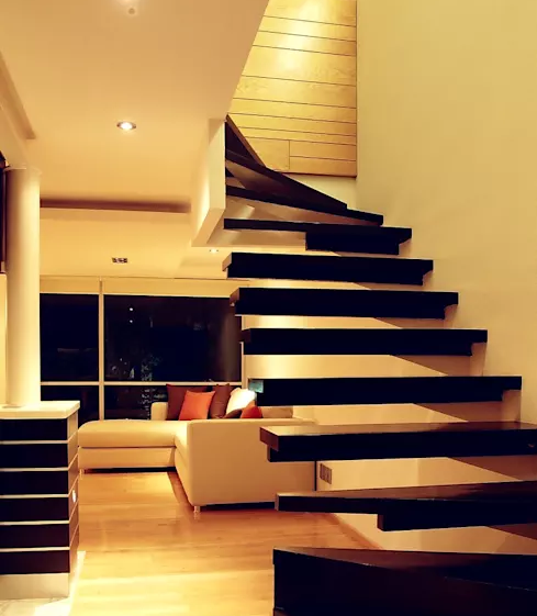 Cầu thang có các bậc nổi như lơ lửng giữa căn nhà. Cấu trúc này vừa phù hợp với tổng thể ngôi nhà vừa đem lại cảm giác thoáng đãng vì ánh sáng có thể xuyên qua từng bậc thang.