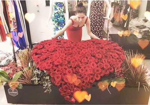 | Dịp Valentine vừa rồi, người mẫu Ngọc Trinh khoe hình ảnh bó hồng khổng lồ do bạn trai đại gia tặng cô khiến nhiều người choáng váng. Theo ước tính, bó hoa hồng này có trị giá gần 7.000 USD, tương đương 150 triệu đồng. |