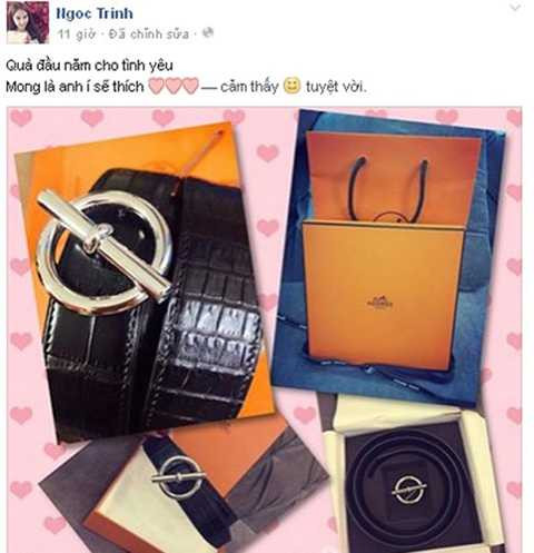| Đây không phải lần đầu Ngọc Trinh nhận quà tặng đắt tiền của đại gia nhân ngày lễ tình nhân. Cô từng được tặng một bó hoa tươi và chiếc đồng hồ hiệu Piguet, trị giá hơn 800 triệu đồng. |