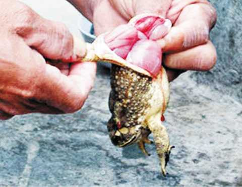 Do độc tố bufotoxin và một số chất khác có nhiều trong gan, trứng, da cóc, 1-2 giờ sau khi ăn, các độc tố này gây ra các triệu chứng nổi bật cho người bệnh là đau bụng, buồn nôn, nôn, tăng huyết áp, rối loạn nhịp tim nặng, suy hô hấp và ngừng thở, trụy mạch, tử vong chỉ sau 3- 4 giờ nếu không được cứu chữa kịp thời tại các Khoa Cấp cứu và Hồi sức Chống độc.