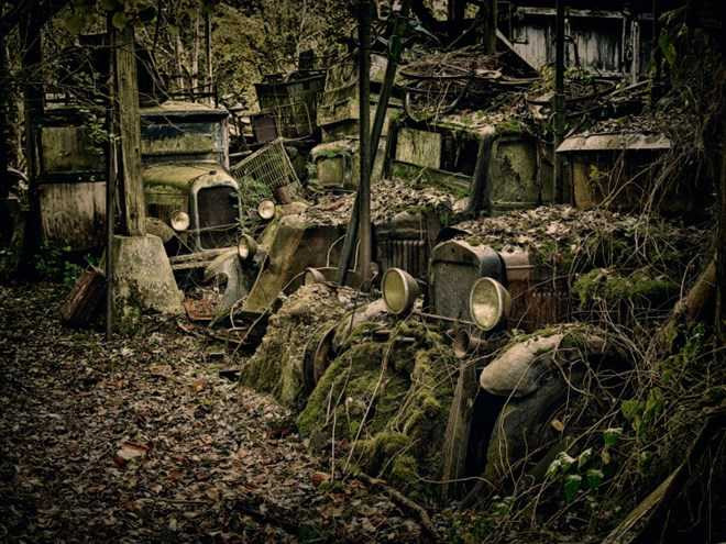 Những ô tô cũ đổ nát, đè lên nhau trong khu rừng sâu bí ẩn