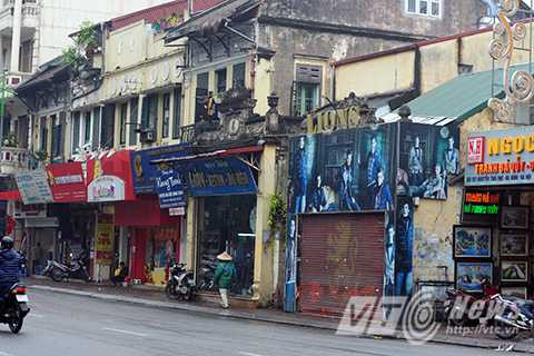 | Những ngôi nhà lộn xộn, nằm nhấp nhô trên vỉa hè phố Quốc Tử Giám khiến người đi bộ chỉ còn cách đi xuống lòng đường. |