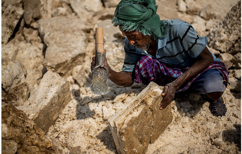 Những người đi khai thác dùng các dung cụ thô sơ để cắt, mang vác trên vai và đưa đi bán bằng lạc đà
