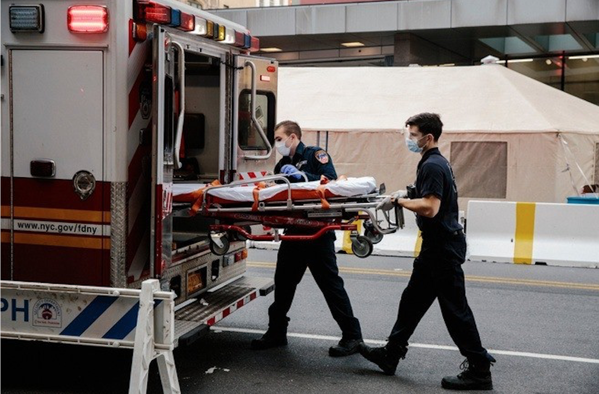 Nhân viên y tế vận chuyển một bệnh nhân nghi nhiễm bên ngoài bệnh viện Presbyterian ở Manhattan. (Ảnh: New York Times).