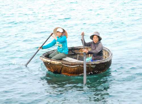 Không chỉ cánh đàn ông đi biển ăn sóng nói gió, các chị tóc dài, khẩu trang bịt mặt che nắng, uyển chuyển bơi chèo như không cần dùng sức, giọng nói vẫn nhẹ nhàng nữ tính, với nước da mịn màng rám nắng, chỉ có đôi bàn tay của các chị là chai sần với những vết cắt của lưới, là minh chững của sự vật lộn cùng những con sóng dữ…