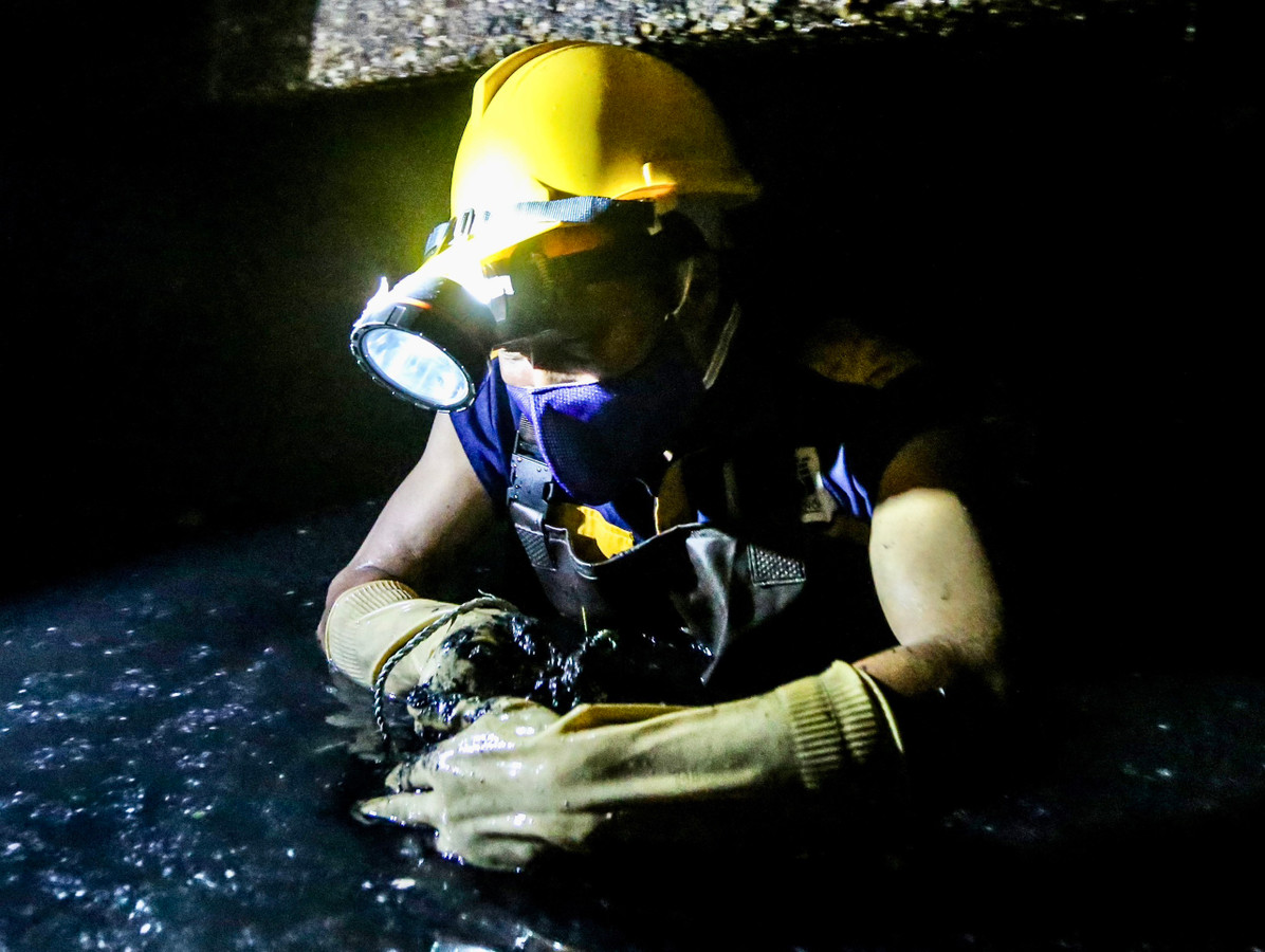 Là người trực tiếp xuống xử lý rác thải dưới cống ngầm, anh Vũ Văn Tiến Quỳnh (42 tuổi) cho biết, công việc trong ca của tổ anh là nạo vét khoảng 100m cống dưới tuyến phố đường Thuỵ Khuê. Đoạn cống này rộng khoảng 3m, cao 1m7. Làm việc trong môi trường ngột ngạt, nước thải ngập ngang ngực, đầu sát thành cống nên chỉ sau 15 phút làm việc, gương mặt anh Quỳnh đã nhễ nhại mồ hôi.