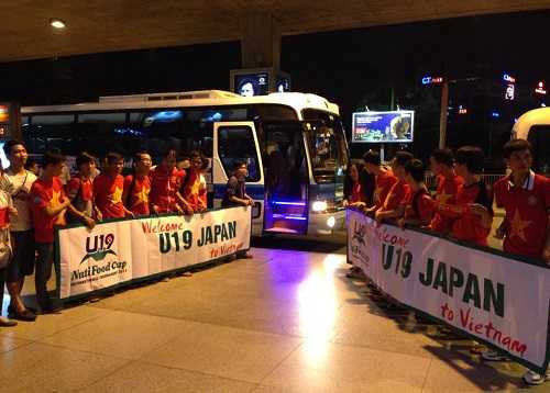 | Hội CĐV bóng đá Việt Nam đón các cầu thủ U19 Nhật Bản tận xe (Ảnh: Hoàng Tùng) |