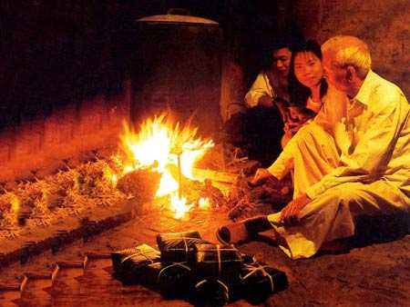 | Nhớ nhất là những lúc ngồi bên bếp lửa hồng chờ bánh chưng chín, nghe ông kể chuyện xưa |
