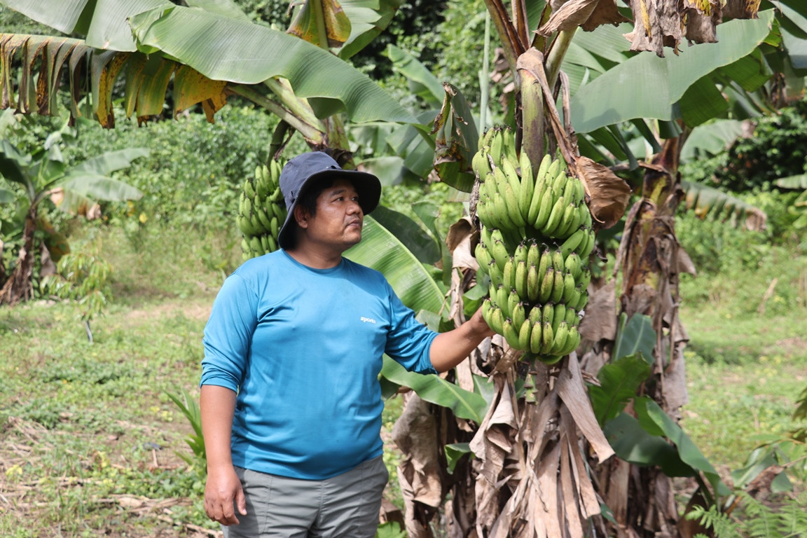 Cách nhà bà Bích không xa, gia đình anh Pơ Nong Niêm (thôn Ra Đung) cũng đang dần thoát nghèo nhờ thay đổi tư duy sản xuất. Trên diện tích hơn 2.000m² vốn chỉ trồng lúa và hoa màu hiệu quả thấp, sau khi được hỗ trợ 80 triệu đồng từ Nghị quyết 35 phát triển kinh tế vườn và được xã tập huấn kỹ thuật, anh Niêm quyết định cải tạo lại toàn bộ khu đất.