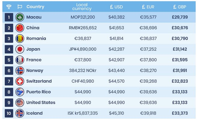 Về phân khúc xe điện, Confused.com lựa chọn Tesla Model 3 là mẫu xe tiêu biểu. Giá bán của mẫu xe này tại Đặc khu hành chính Ma Cao, Trung Quốc là rẻ nhất với 40.382 USD, theo sau là Trung Quốc, Romania, Nhật Bản và Pháp. Mỹ đồng vị trí thứ 8 với Puerto Rico cùng giá bán 44.990 USD.