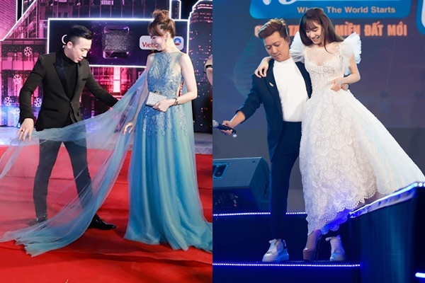 Phải diện những bộ váy cầu kỳ trong các sự kiện đặc biệt đúng là khó khăn của phái đẹp. Chẳng những đi đứng bất tiện, các nghệ sĩ nữ còn phải thường xuyên chú ý để chiếc váy không bị mất form dáng thì mới có thể chỉn chu trước ống kính. Thế nhưng, Hari Won, Nhã Phương và Thu Trang đi đâu, mặc gì cũng có ông xã không ngại ở bên "nâng váy sửa tà".