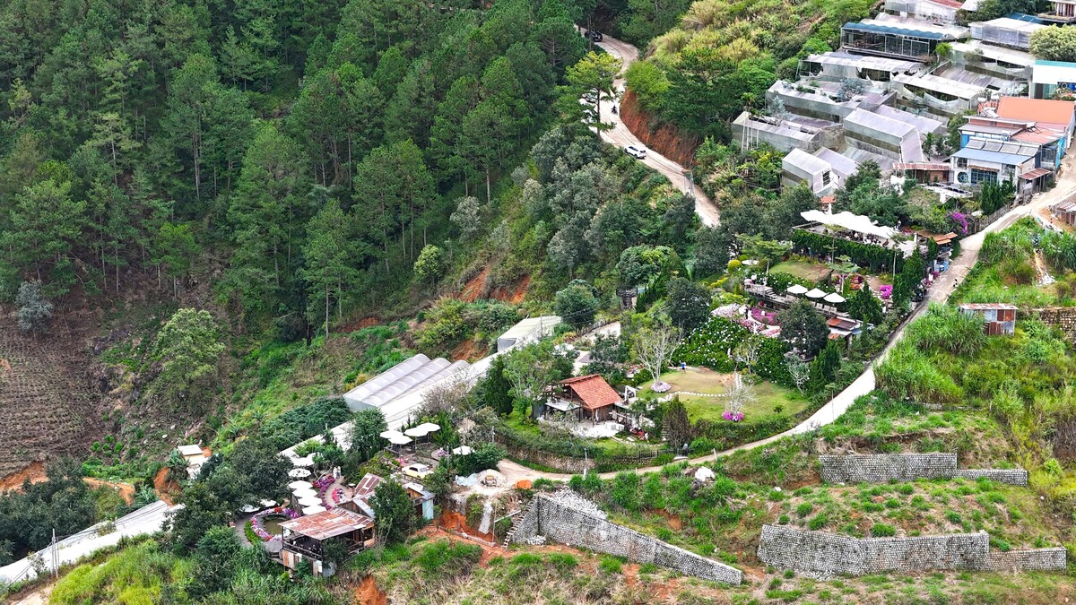 Một khu có nhiều quán cà phê, ăn uống nổi tiếng trên đường Hùng Vương với nhiều công trình nằm sâu trên sườn đồi cạnh những nhà kính của người dân.