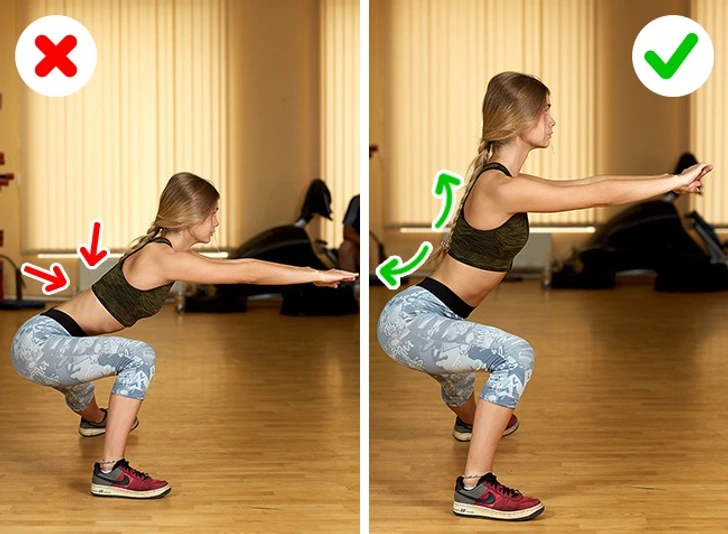 Đúng: Kéo vai về phía sau, đồng thời ép hai bả vai lại với nhau, giữ lưng thẳng, lưng dưới hơi cong, đùi phải song song với sàn khi ngồi xổm.