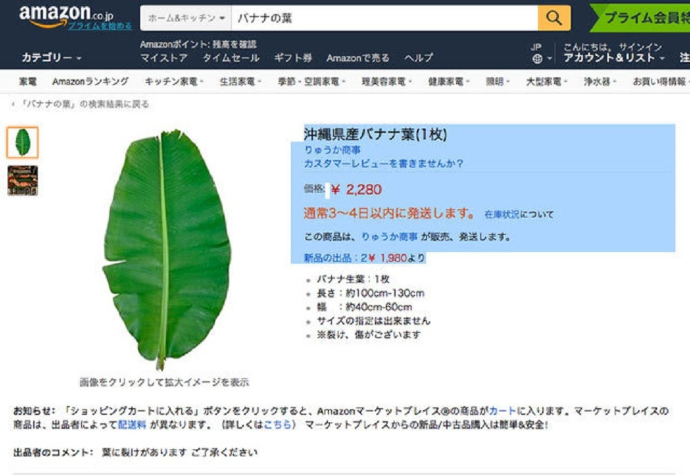 Không chỉ thân chuối mà lá chuối cũng từng được rao bán "đắt cắt cổ" trên trang Amazon Nhật Bản. Cụ thể, trang mua bán Amazon Nhật Bản rao bán những chiếc lá chuối với giá bán 2.280 yên, tương đương 500.000 đồng, mua càng nhiều, giá bán càng rẻ. Mua 3 lá, giá chỉ khoảng 760.000 đồng và nếu mua 5 chiếc lá chuối thì giá chỉ còn lại là 1.168.000 đồng.