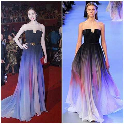 Linh Chi từng thừa nhận vì quá thích thiết kế màu ombre này của Elie Saab nên cô đã nhờ một người bạn tìm được loại vải y hệt để may trang phục dự Festival Model Awards 2015.