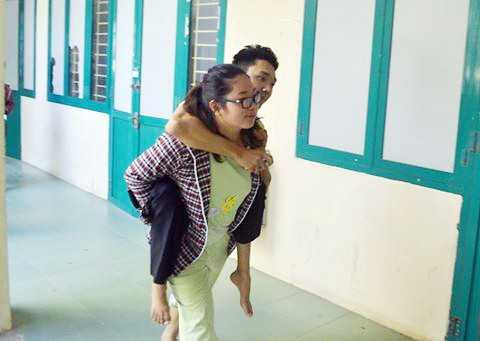 Thí sinh Vũ Văn Nội sáng nay được chị gái cõng vào phòng thi tại Đại học Hồng Đức, Thanh Hóa. Chị gái Nội là Vũ Hoài Thanh (xã Vân Du, huyện Thạch Thành, Thanh Hóa) cho biết, Nội bị tai nạn từ khi 3 tuổi, dẫn đến bại liệt từ phần ngực xuống chân.