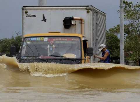 | Một chiếc xe tải di chuyển trong nước lũ |