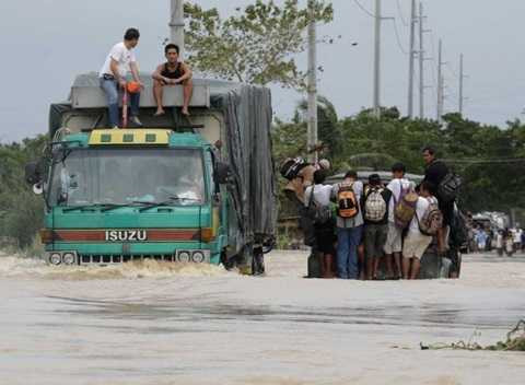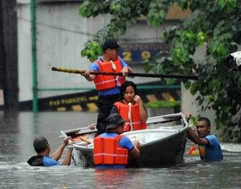 | Nhân viên cứu hộ đưa một nạn nhân ra khỏi khu vực ngập nước trên đảo Luzon, Philippines. |