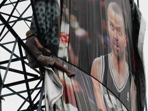 | Công nhân dỡ poster quảng cáo trước khi bão Utor tấn công Philippines |