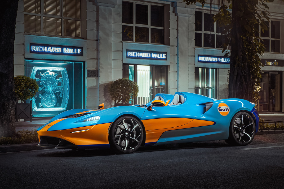 Chiếc xe được mang về Việt Nam là phiên bản McLaren Elvo Gulf Theme với màu sơn trang trí theo phong cách xe đua, phối giữa màu xanh lam và cam.