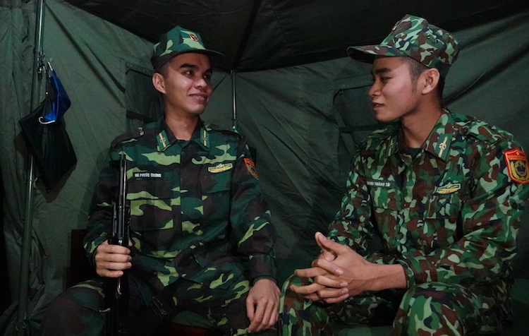 Võ Phước Trung (trái) và Danh Thành Tài tại chốt 1332 của Đồn Biên phòng Hoành Mô, Quảng Ninh.