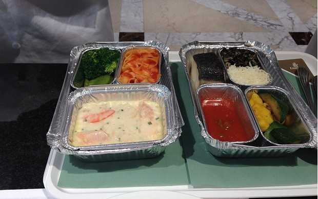 Tất cả các suất ăn đều được nấu và đóng hộp từ mặt đất rồi hâm nóng trên máy bay trước khi phục vụ hành khách.